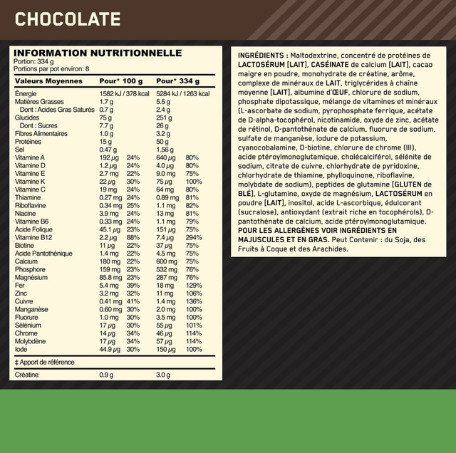 - Riche en protéines : mélange whey + caséine pour une construction musculaire continue.